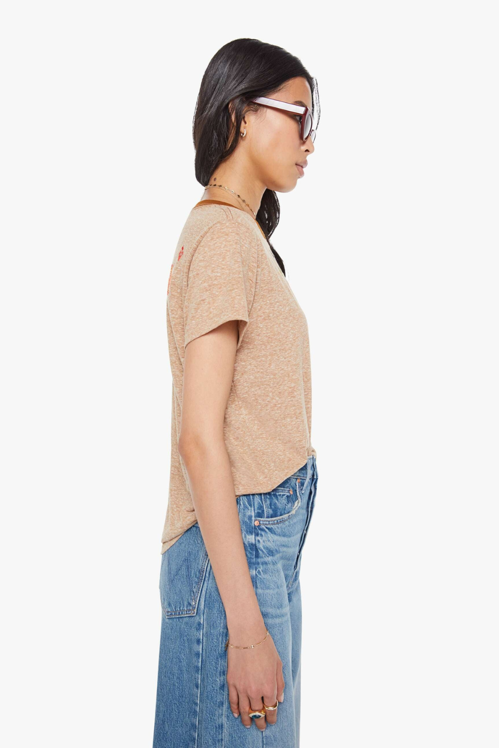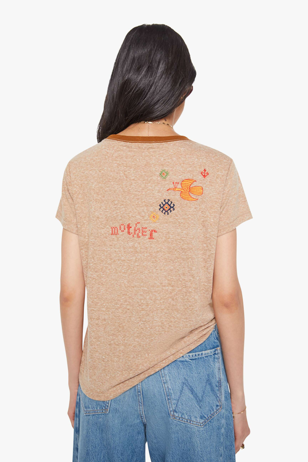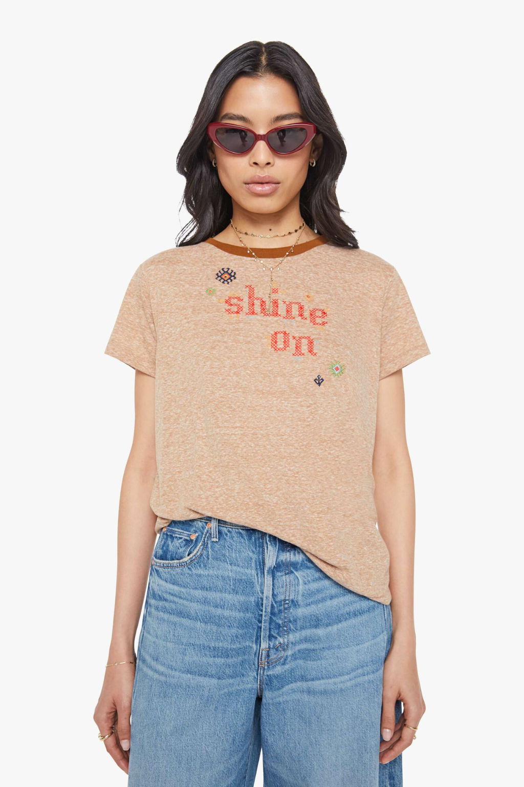 Shine on. A soft crewneck with a slim fit for a vintage look and feel. Made from a cotton blend in heathered tan with dark brown trim along the neck, the tee features red text and colorful folk-inspired embroidery throughout.