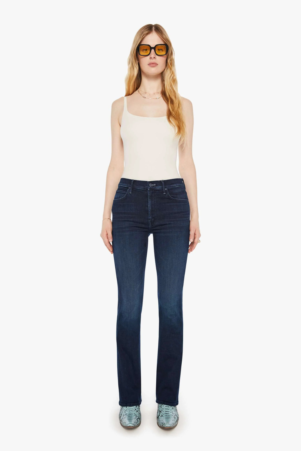 Change your tune. Mid-rise jeans with a flared leg, zip fly and a long 31-inch inseam with a clean hem. Crafted from soft stretch denim, Karaoke In Kyoto is a dark blue with subtle fading and whiskering.