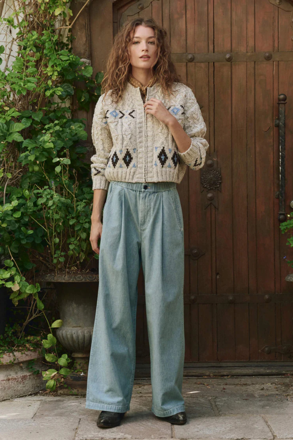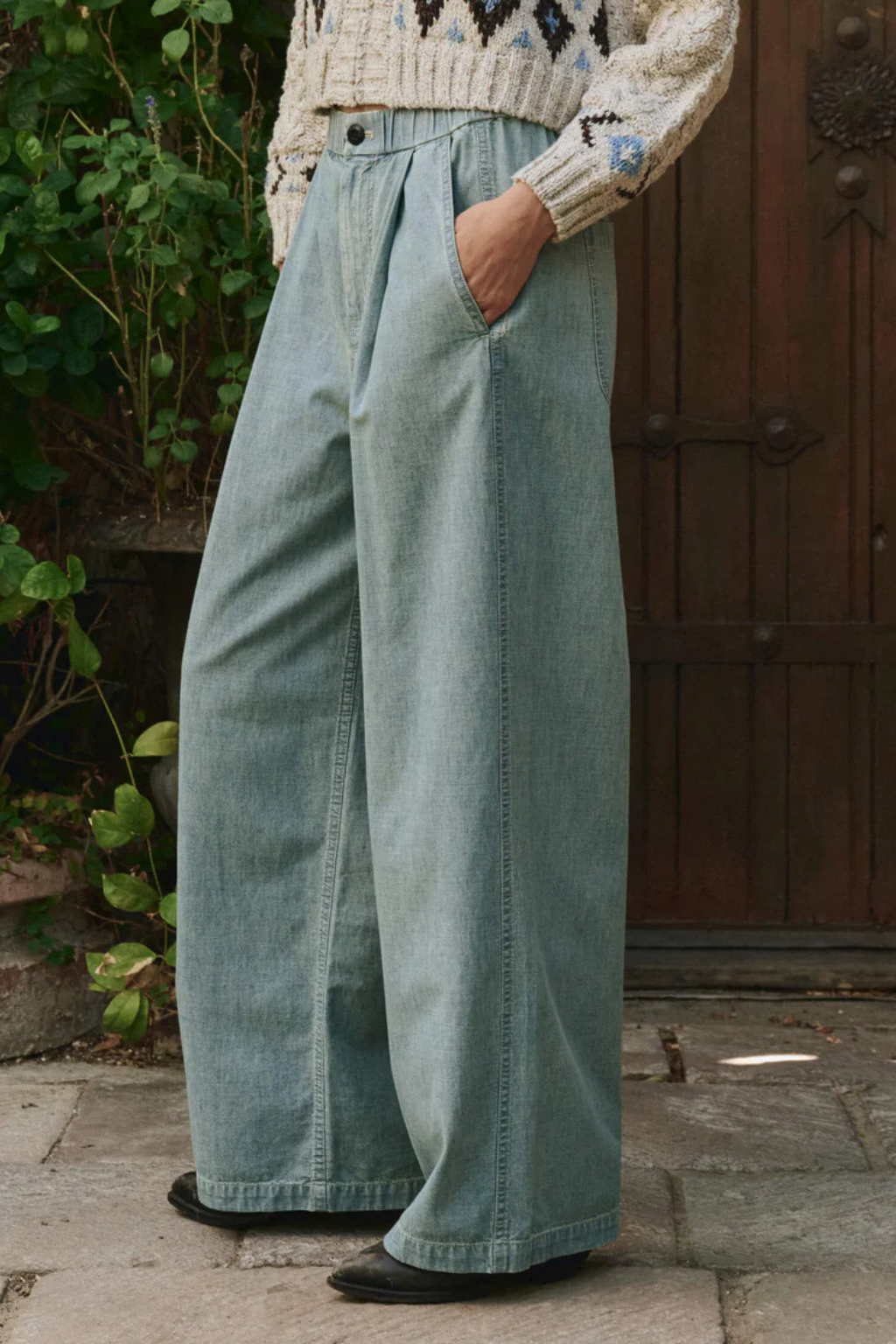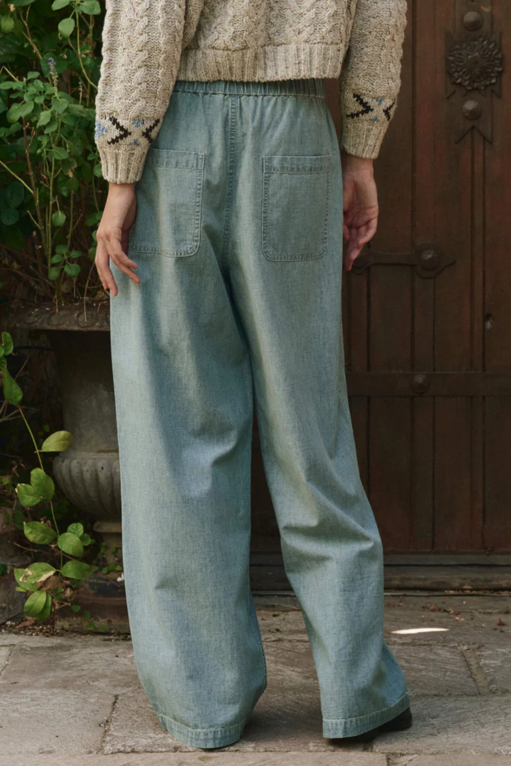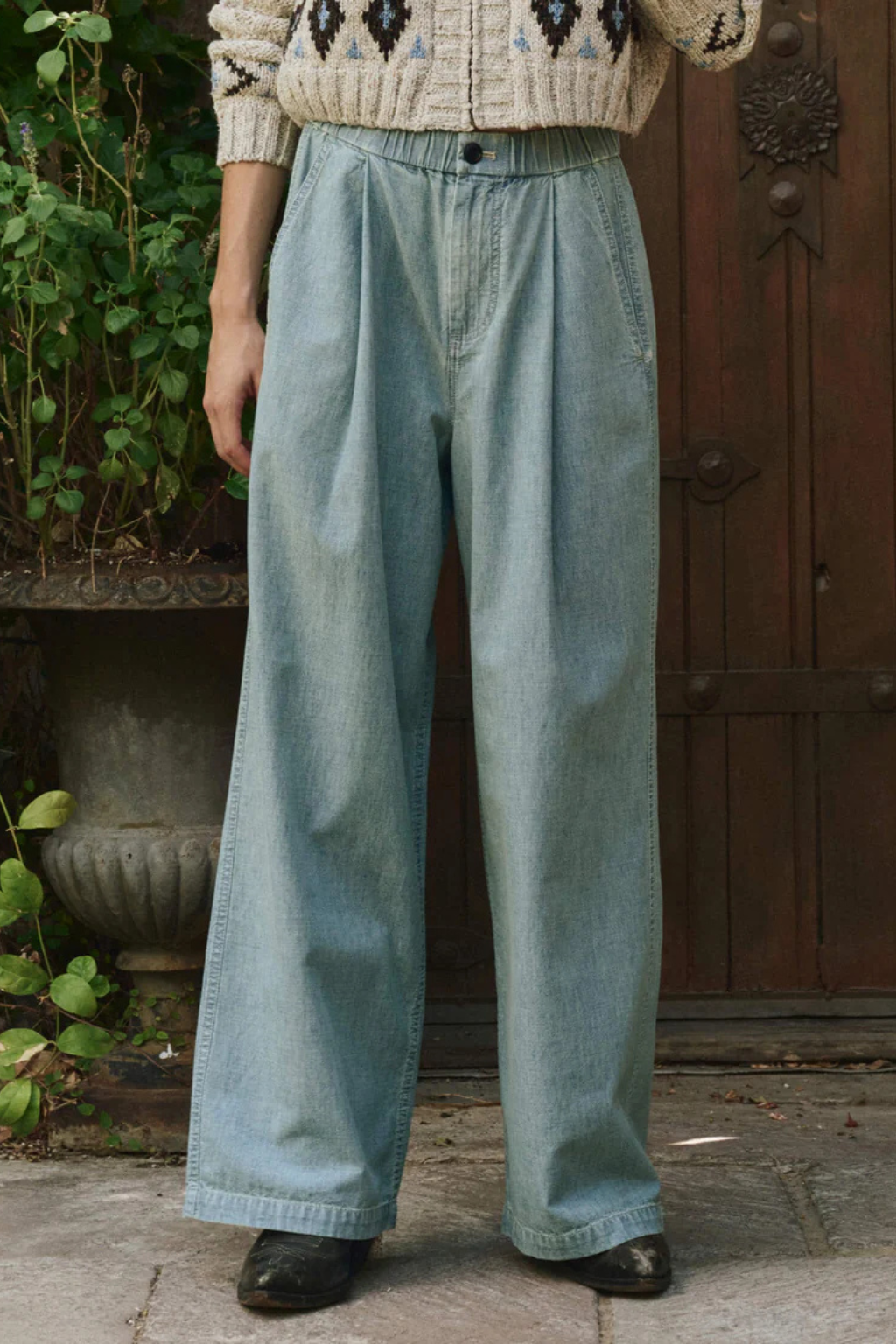 Designed for ultimate ease and style, The Sawyer Pant is a slouchy pull-on pleated pant with a relaxed fit and elasticated waistband. Featuring a zip fly with a corozo button and slant front pockets, this piece mixes comfort with functional details. Rounded back patch pockets add a hint of practicality, while the long inseam gives it that perfect, effortless drape. Made from lightweight yarn-dyed chambray, these pants offer a soft, worn-in feel that only gets better with time.