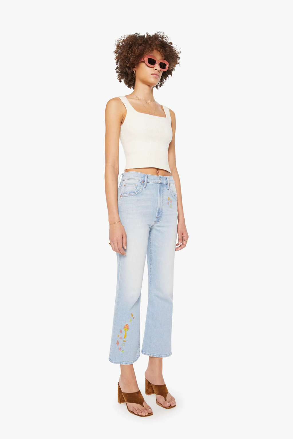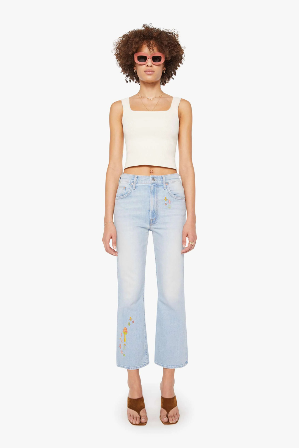 Designed to sit on the hips with a slouchy fit, these jeans feature a flared leg, ankle-length inseam and a super high rise with a slightly dropped crotch. Cut from semi-rigid SUPERIOR denim, Going Out On A Limb is light blue with colorful embroidered flowers and mushrooms at the hip and ankle, whiskering and fading at the knees.