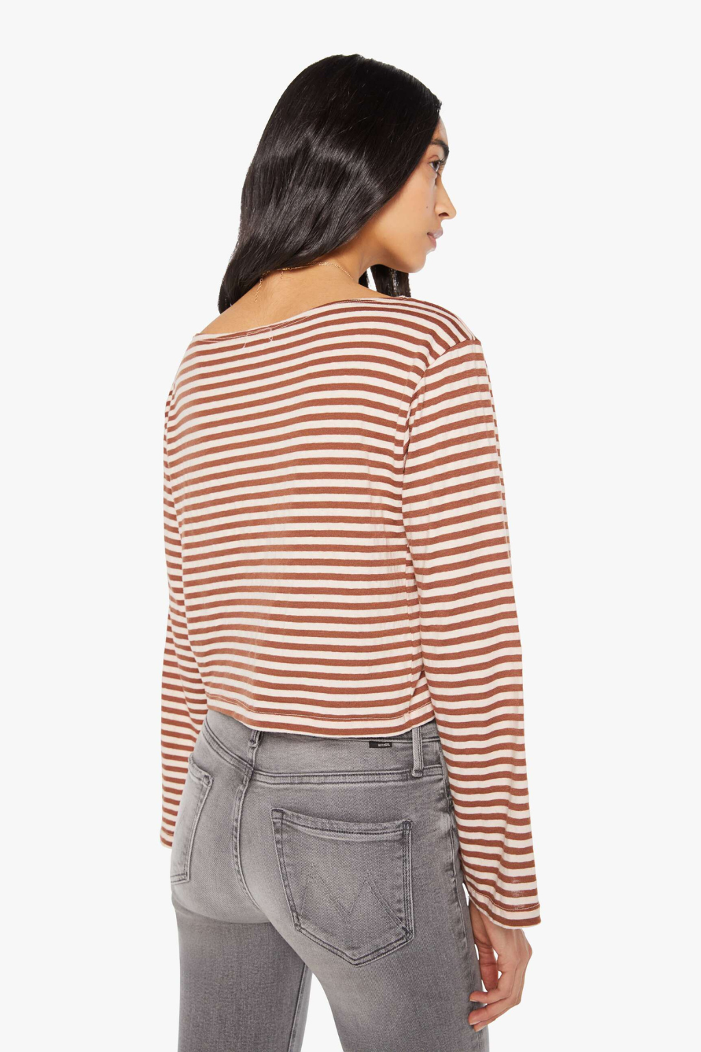 A long sleeve tee with a boat neck and boxy fit. Made from stretch cotton, the top is designed in horizontal brown-and-white stripes.