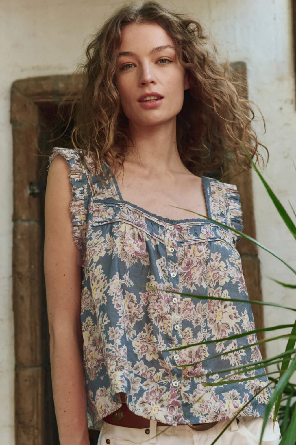This top features pintuck and pleat detailing at the front and back neckline and shoulders, creating a refined, textured look. The flowy silhouette is crafted from lightweight, textured cotton slub, adorned with Pre Fall’s Indigo Floral Print. It has a square neckline trimmed with delicate cotton lace, a front button placket with shirting buttons, and scooped armholes with ruffle edges and a picot finish for added charm.