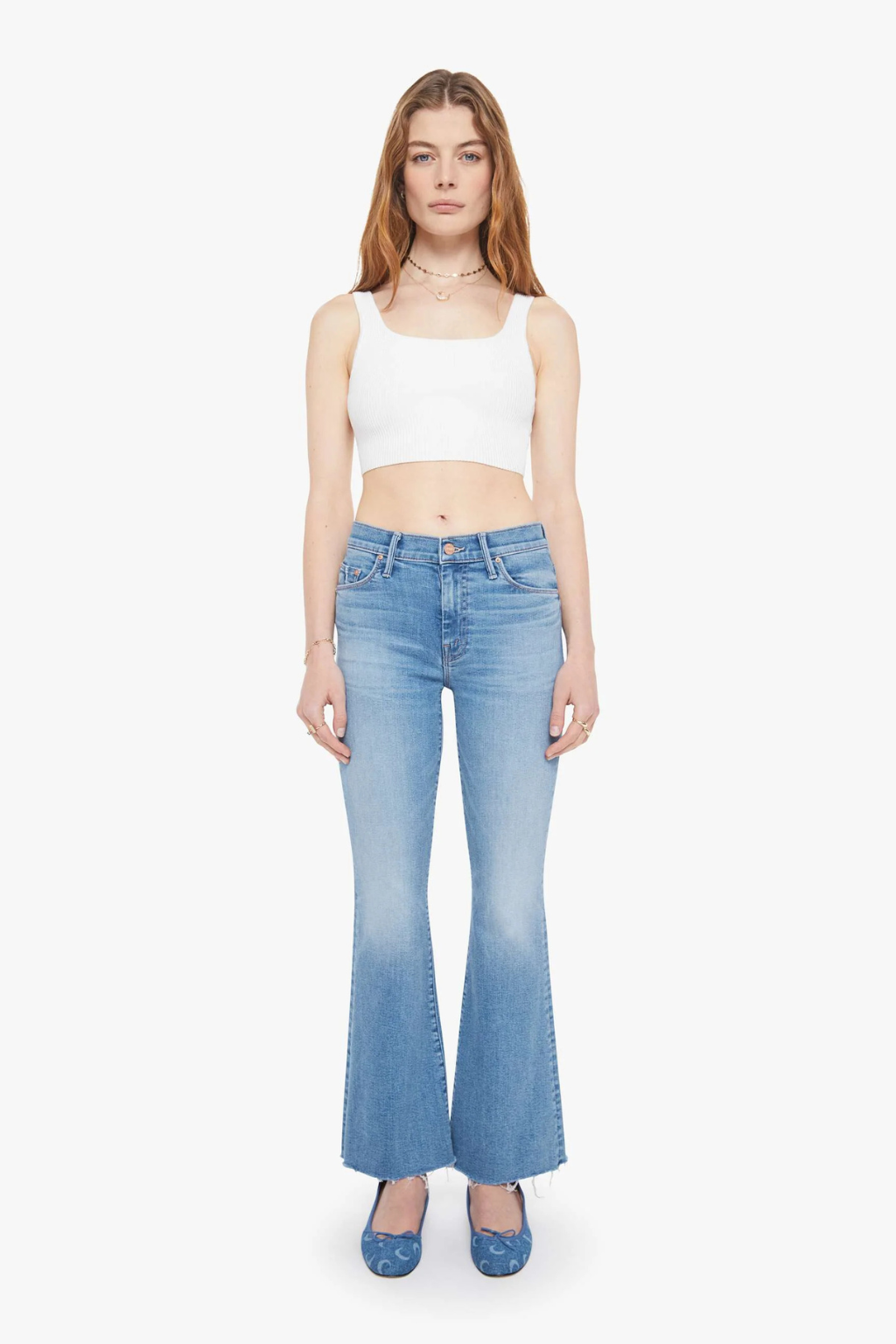 Full throttle. Mother's most popular mid-rise flare has a zip fly, 32.25-inch inseam and a frayed hem. Made from a blend of recycled stretch denim, Ride Hard Live Louder is a light blue with subtle whiskering and fading at the knees.