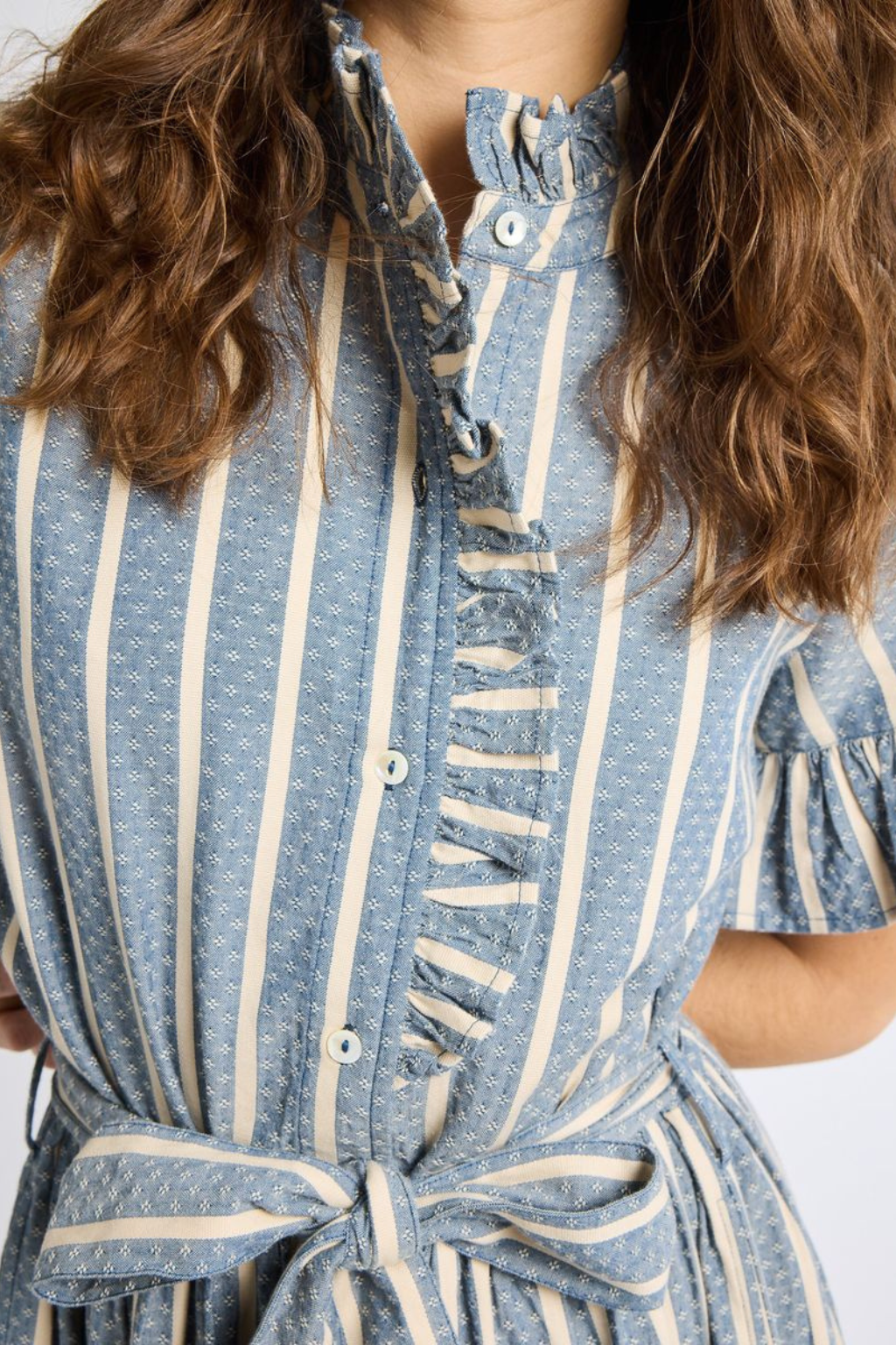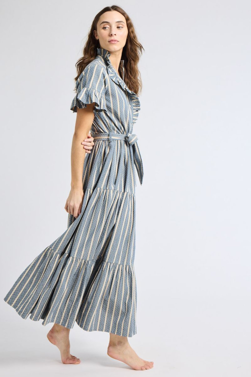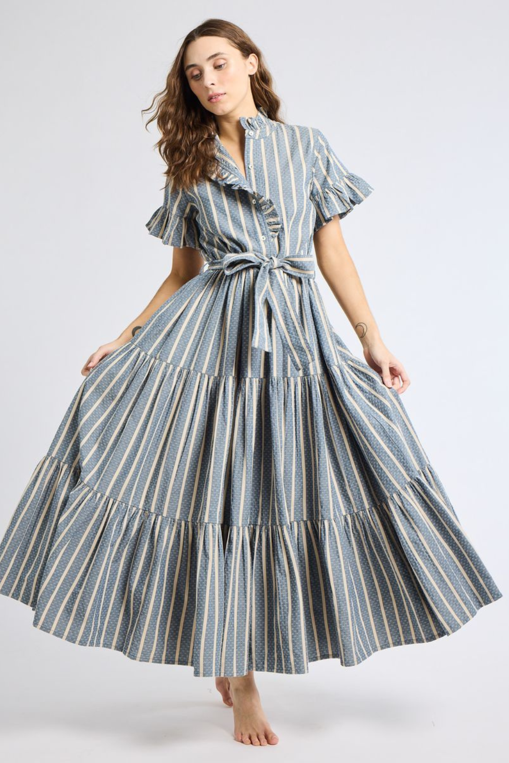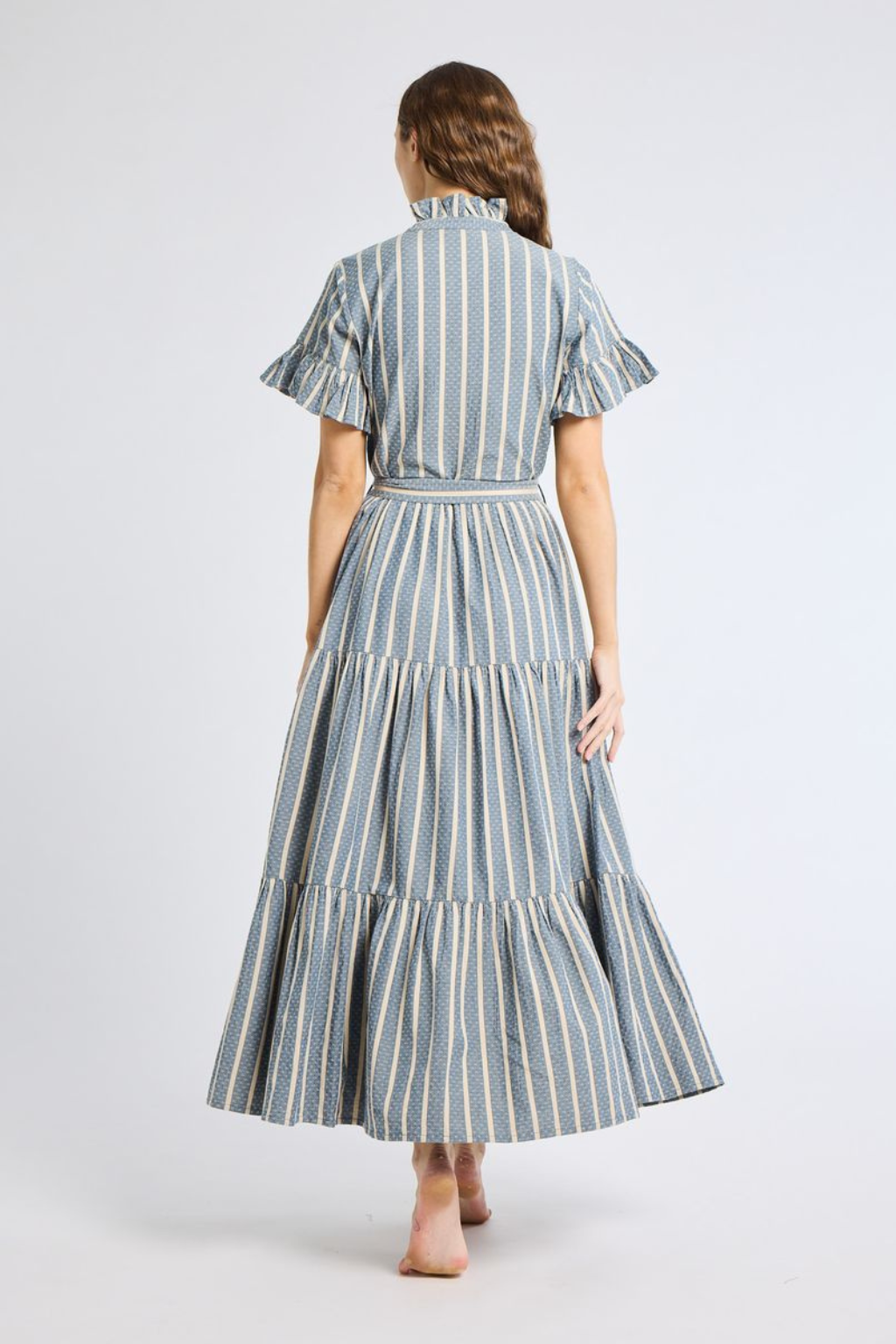 Victoria is a Mille staple. They added a tiered maxi skirt, to their best-selling Vanessa top et Voilà! Victoria has volume and movement but also looks clean and pulled together. The belted waist creates shape and a polished look. Button down top with ruffle placket and sleeve detail.