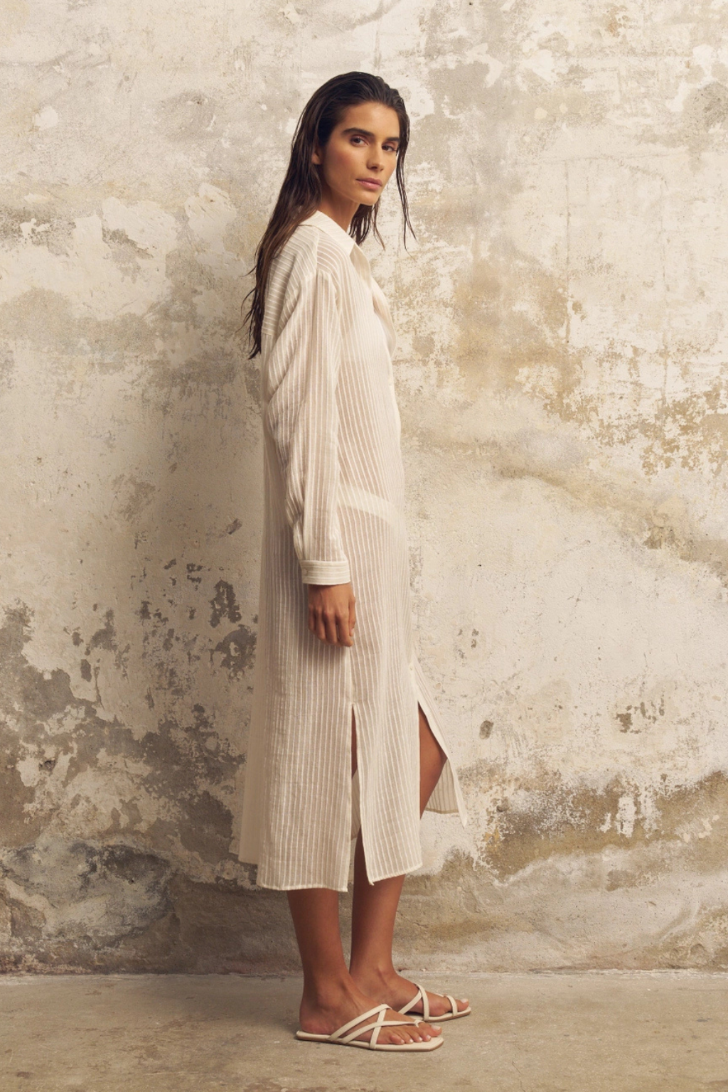 Featuring a button-down front and a relaxed fit, this versatile shirt dress allows for effortless styling. Crafted from 100% Turkish cotton with soft, hand-loomed striped fabric, it can be worn open-front over swimwear or buttoned up as a chic beach cover-up. With a classic collar, rollable sleeves and side slits, it’s an essential addition to your summer wardrobe, perfect for beachside lounging or strolling through vacation days in style. Comes with rope belt.