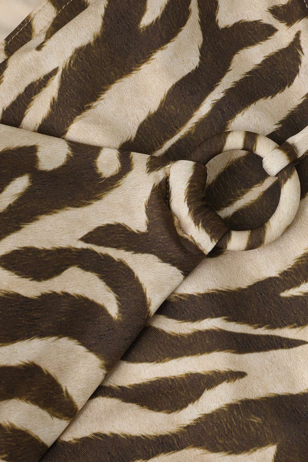 The Wanderlust Ring-Tie Bikini in Zebra from the Resort Swim 2026 Collection. Lycra bikini set with metallic finish, triangle top with removable soft cups and low-rise, skinny pant featuring rings throughout and self-tie straps with toggle ends.