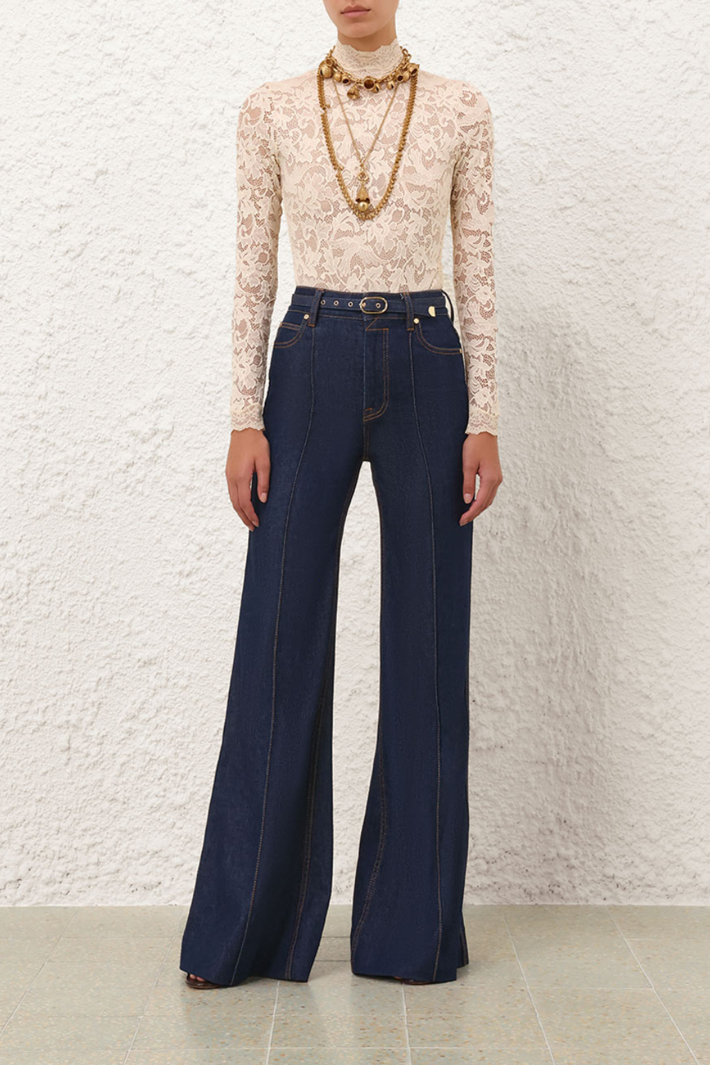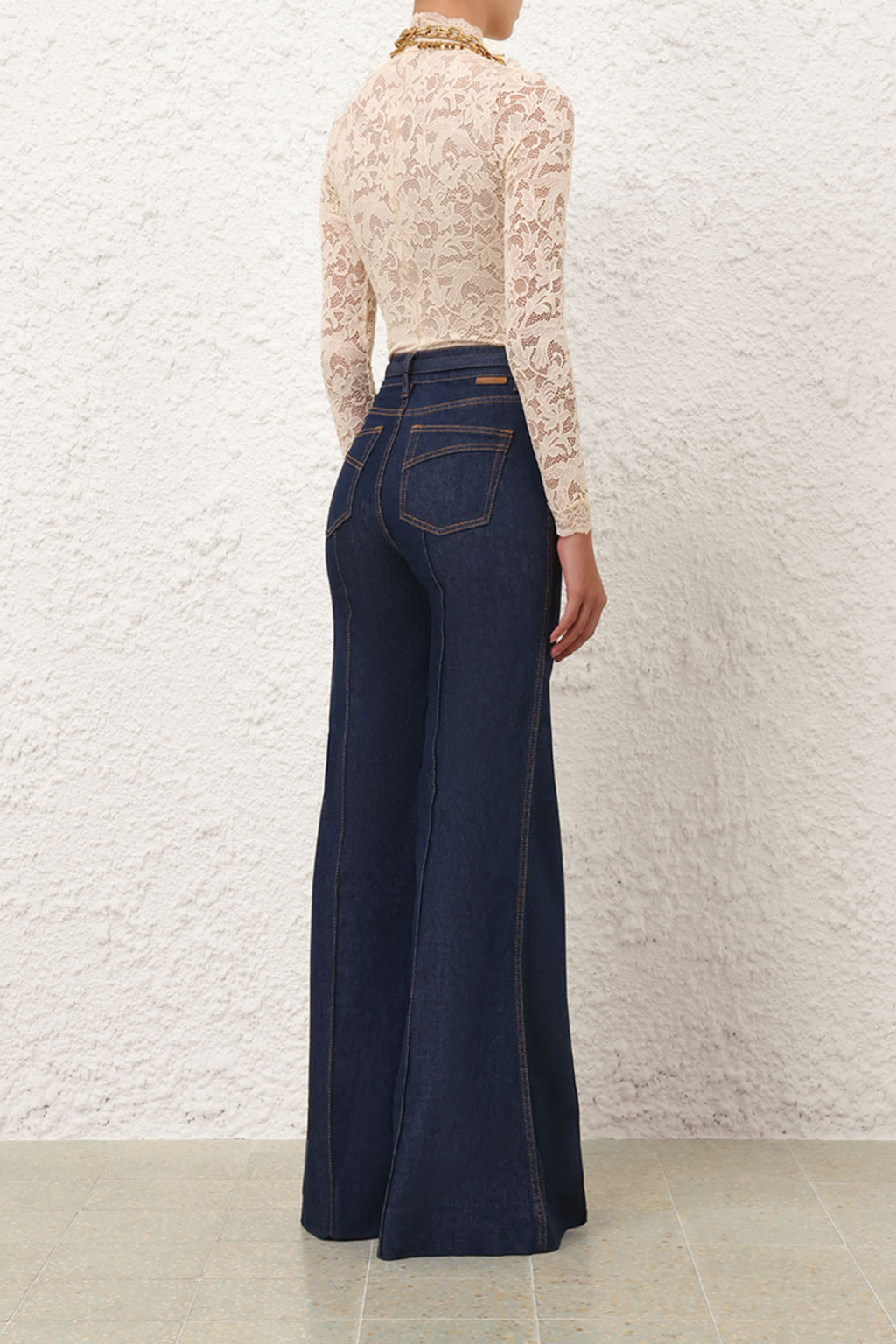 The Wide Leg Jean in Ink from the Fall 2025 Collection, Hypnotic. A denim jean featuring a wide leg silhouette, finished with custom topstitching throughout and removable belt.