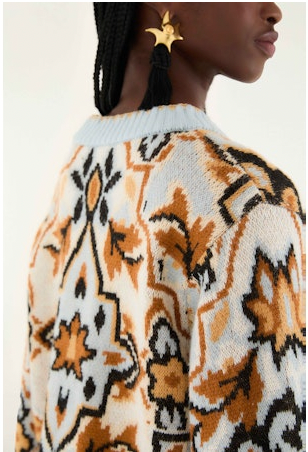 Envelope yourself in the Winter Tapestry Sweater by FARM Rio, a captivating blend of sky blue and earthy mustards. This charming piece features a ribbed crew neckline, complemented by a rich multicolored tapestry pattern that weaves a story across the back and sleeves. The relaxed silhouette invites a sense of ease and comfort, making it a delightful addition to your wardrobe that resonates with the spirit of Brazilian joie de vivre.