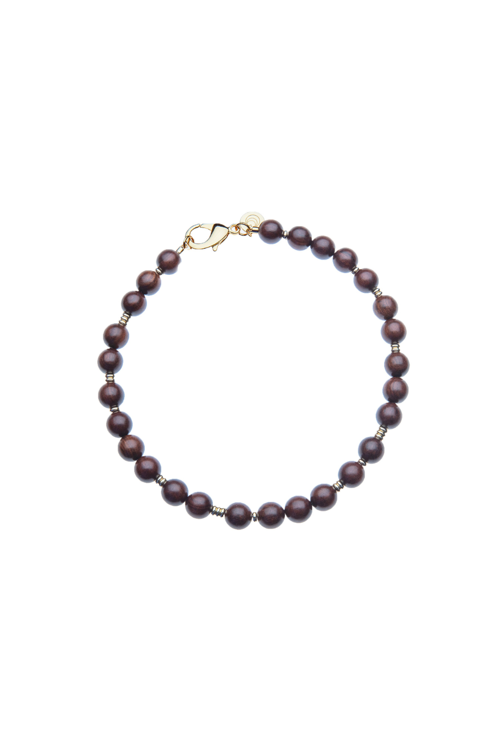 Natural wood beads make up the body of the necklace with pops of gold beads in between. Clasp is brass with 14k gold plating.